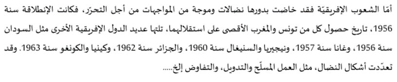 «… علينا الآن الاهتمام بنوع آخر من الصّراع الناتج مباشرة عن الحرب العالمية الثانية. إذ كان من الأهداف الأساسية للميثاق* دعم تنمية المناطق التي لم تتمتّع بالحكم الذاتي والارتقاء بها إلى مصاف الأمم. لقد شهدت السنوات العشر الأولى بعد الحرب حصول معظم بلدان آسيا التي تحرّرت من الهيمنة الاستعمارية على استقلالها. بحيث لم يتبقَ اليوم سوى بعض الجيوب الاستعمارية. أمّا في أفريقيا فلم يتم إحراز تقدّم ملحوظ في هذا الاتجاه إلاّ خلال السنوات الخمس الماضية…»