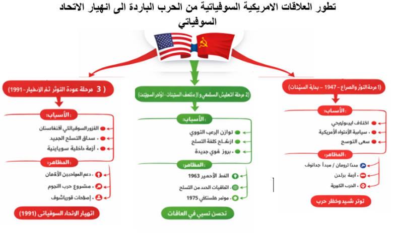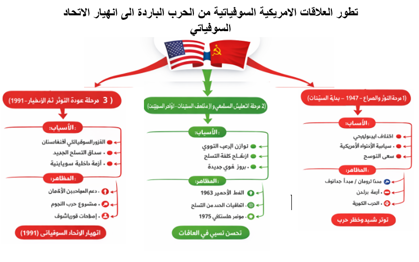 | 🔴 التوتر والصراع | 1947 – بداية الستينات | قطيعة وصراع إيديولوجي وسياسي | – اختلاف إيديولوجي (رأسمالية / اشتراكية) – رغبة كل طرف في التوسع ونشر نفوذه – خرق الاتفاقيات بعد الحرب العالمية الثانية – سياسة الاحتواء الأمريكية | – مبدأ ترومان – مبدأ جدانوف – أزمة برلين – الحرب الكورية | توتر شديد وخطر حرب مباشرة |